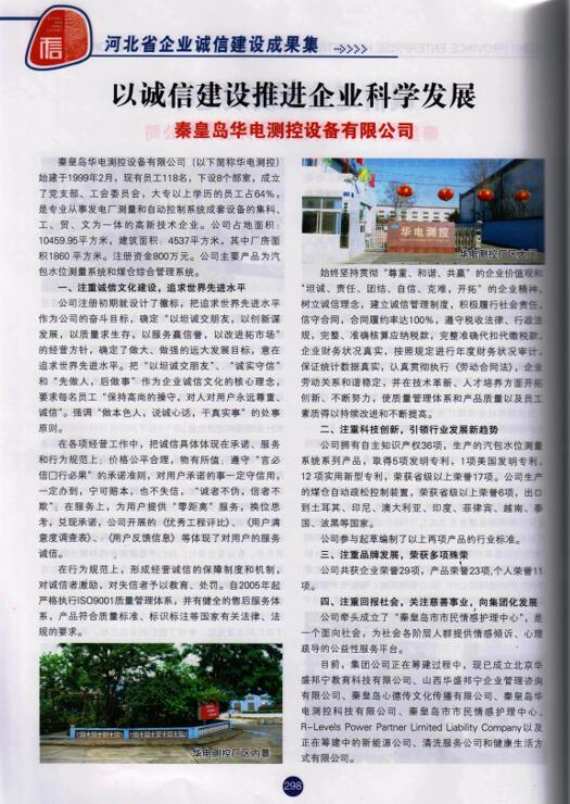 秦皇島華電測控設備有限公司自1999年成立以來,始終秉持“以坦誠交朋友,以創新謀發展,以質量求生存,以服務贏信譽,以改進拓市場”的經營方針從事經營活動,“誠信、坦誠”始終被放在首位!