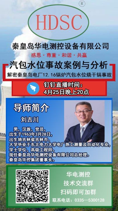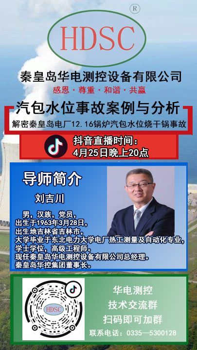 2020年4月25日晚8時(shí),秦皇島華控集團(tuán)有限公司董事長劉吉川先生攜手【熱控圈】舉辦“火力發(fā)電廠鍋爐汽包水位測(cè)量系統(tǒng)系列講座之解密秦皇島電廠12.16鍋爐汽包燒干鍋事故”?!扒Я摹?、“抖音”、“釘釘”軟件同步直播。