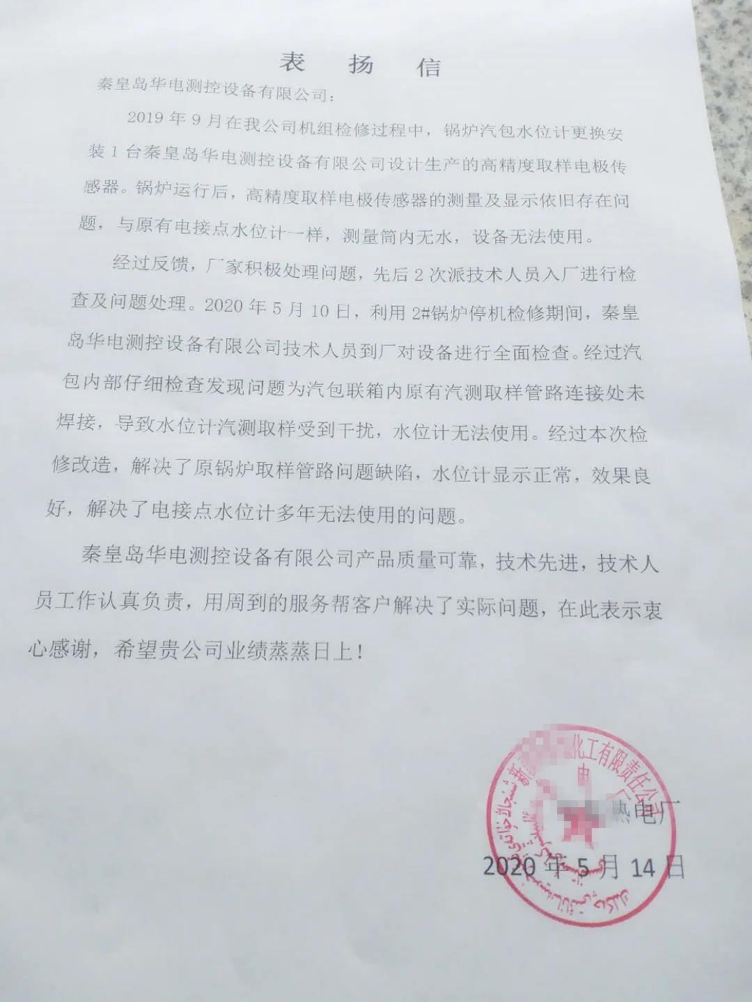 2020年5月15日,華電測控收到來自新疆某化工有限公司的表揚信,表揚我公司解決了該廠鍋爐汽包電接點水位計多年無法使用的問題。信中對我公司的產品質量、全新全意為客戶服務的理念以及技術人員認真負責的工作態度均給予肯定。