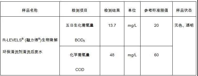 融力得®生物降解環保清洗劑經英格爾檢測技術服務(上海)有限公司檢驗,生化需氧量為13.7 mg/L,遠遠高于中國國家環保標準要求,可以通過工廠現有污水處理系統進行排放。