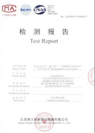 融力得®生物降解環保清洗劑除垢率優于DL/T 957-2017《火力發電廠凝汽器管化學清洗及成膜導則》和DL/T 523-2017《化學清洗緩蝕劑應用性能評價指導及試驗方法》。清洗除垢效果顯著。