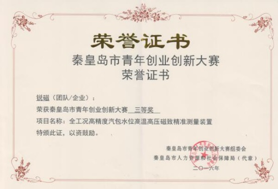 為給用戶提供更好的產(chǎn)品和服務,華電測控始終致力于產(chǎn)品的研發(fā)和創(chuàng)新。早在2016年5月,公司組建“銳磁”和“新媒體”兩個團隊參加秦皇島市青年創(chuàng)業(yè)創(chuàng)新大賽,其中“銳磁”團隊的參賽項目為《全工況高精度汽包水位高溫高壓磁致精準測量裝置》,“新媒體”團隊的參賽項目為《煤倉綜合管理系統(tǒng)》,經(jīng)過不斷開拓創(chuàng)新,兩個項目先后在市級、省級及國家級的比賽中連獲殊榮。《全工況高精度汽包水位高溫高壓磁致精準測量裝置》獲得秦皇島市青年創(chuàng)業(yè)創(chuàng)新大賽三等獎,第二屆“中國創(chuàng)翼”青年創(chuàng)業(yè)創(chuàng)新大賽高端設備制造類項“金翼獎”;《煤倉綜合管理系統(tǒng)》獲得秦皇島市青年創(chuàng)業(yè)創(chuàng)新大賽三等獎,河北省青年創(chuàng)業(yè)創(chuàng)新大賽三等獎,第二屆“中國創(chuàng)翼”青年創(chuàng)業(yè)創(chuàng)新大賽高端設備制造類項“銀翼獎”。