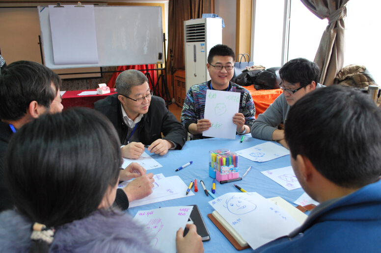 培訓采用“世界咖啡”模式,每六人一組圍坐圓桌,每個人從一幅自畫像開始,表達出自己的心情和期待,接著,徐英教練引導大家回憶公司發展歷程,公司成立十六年來選取其中最重要的十件大事,以及在座每一位進公司以來最重大的事,回顧往昔,從艱苦的創業期,到成長期,集團化期,超越期,大家感慨萬千,往日的一幕幕情景涌上心頭,我們克服了一個又一個困難,取得了一個又一個成果,很多夢想變成了現實,心中滿是喜悅,滿是感恩,回味無窮。大家拿起手中的畫筆,描畫出未來的華電測控宏偉藍圖。一幅幅色彩豐富、無限美好的圖畫掛到了墻上,大家的眼睛閃閃發亮,講述心中的美好遠景,充滿了信心和希望。接下來,大家分組討論公司2015年急需解決的問題,最終選中三個題目“如何提高銷售額”,“如何提高員工積極性”以及“健康生活,快樂工作”,各團隊士氣高漲,帶隊負責人上臺積極的宣講展示,精彩的講解博得大家陣陣歡笑和掌聲。