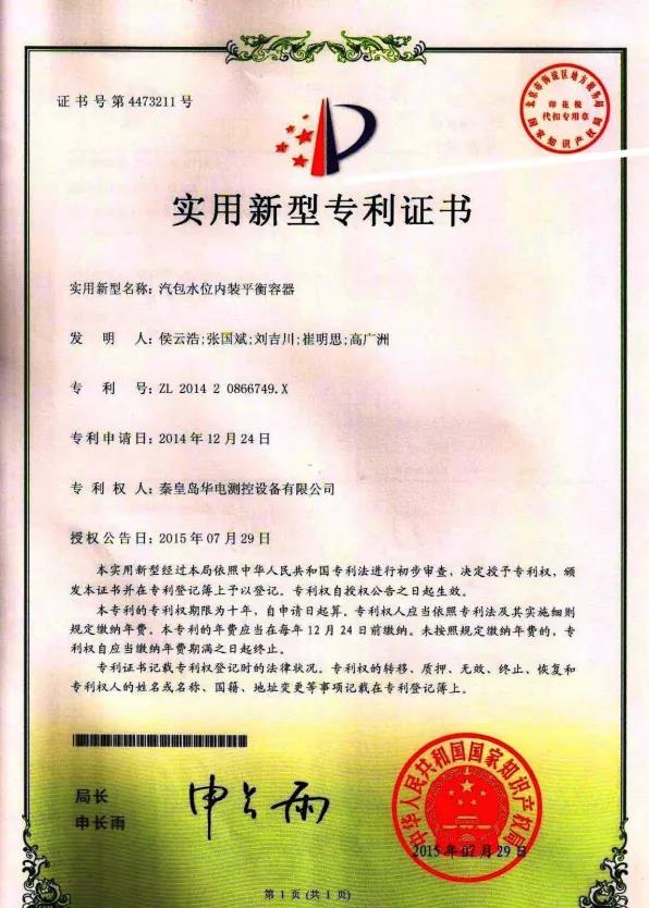 我公司中標的6套內裝平衡容器,型號HDSC-DNZ-2O,是我集團公司下屬秦皇島華電測控設備有限公司自主研發生產的專利產品(專利號:ZL201420866749.X),該產品自投入市場后,使用效果良好,水位測量精準,深受廣大用戶好評。