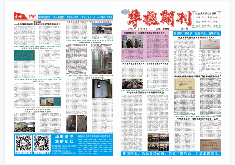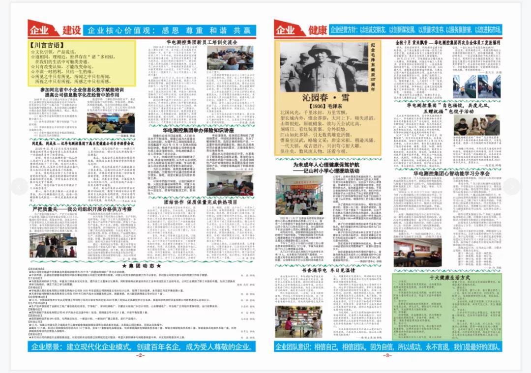 華電測控期刊自創建成立以來,以集團各子公司發展主營業務、黨建活動、情感護理、健康管理為內容,旨在向大家宣傳公司的企業文化和致力于打造“華電測控”品牌形象,堅持為社會謀價值、為客戶謀利益、為員工謀幸福的集團使命;堅持建立現代化企業模式、創建百年名企、成為受人尊敬企業的集團愿景;堅持“以坦誠交朋友、以創新謀發展、以質量求生存、以服務贏信譽、以改進拓市場”的企業經營方針;以“坦誠、負責、團結、自信、克難、開拓”的企業精神為行為導向;在持續發展中展示“務實、創新、超越、追求世界先進水平”的企業宗旨;秉承“創新進取、一流品牌、誠實守信、增值服務、持續改進、用戶滿意”的企業質量方針;營造“感恩、尊重、和諧、共贏”的企業文化氛圍。