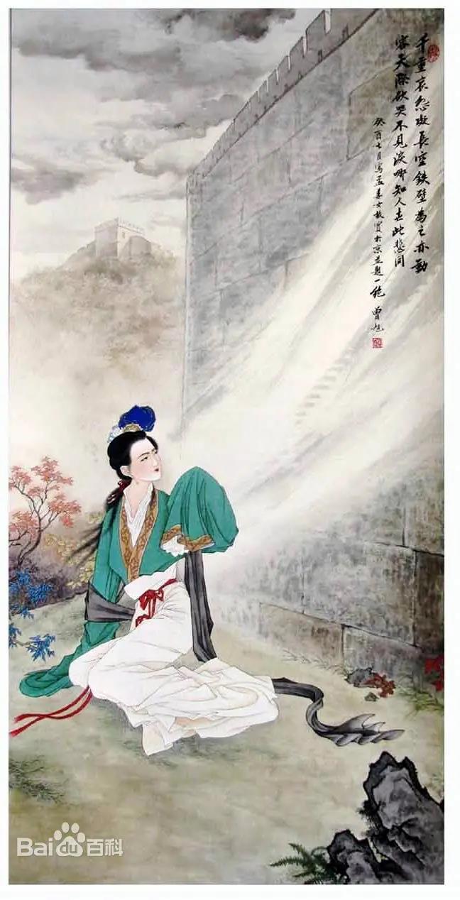 一夜之間,做好棉衣,孟姜女千里迢迢,踏上路程。一路上跋山涉水,風餐露宿,不知饑渴,不知勞累,晝夜不停地往前趕,這一日終于來到了長城腳下。可長城下民夫數(shù)以萬計,到哪里去找呢?她逢人便打聽,好心的民夫告訴她,范喜良早就勞累致死,被埋在長城里筑墻了。孟姜女一聽,心如刀絞,便求好心的民工引路來到了范喜良被埋葬的長城下。坐在城下,孟姜女悲憤交加:想自己千里尋夫送寒衣,盡歷千難萬險,到頭來連丈夫的尸骨都找不到,怎不令人痛斷柔腸。愈想愈悲,便向著長城晝夜痛哭,不飲不食,如啼血杜鵑,望月子規(guī)。這一哭感天動地,白云為之停步,百鳥為之噤聲。直哭了七天七夜,忽聽轟隆隆一陣山響,一時間地動山搖,飛沙走石,長城崩倒了八百里,露出范喜良的尸骨。
