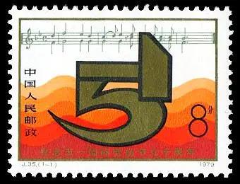 先介紹第一枚郵票,那是中國人民郵政在1979年5月1日發行的《紀念“五一”國際勞動節九十周年》紀念郵票。該套郵票志號:J.35,全套郵票1枚,面值:8分,票名:鐮刀和鐵錘,設計者:鄧錫清。