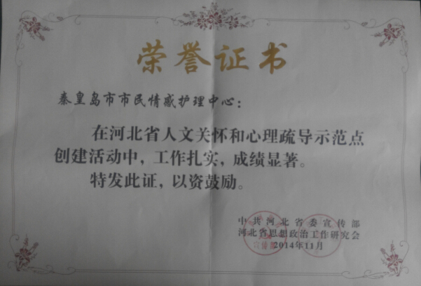 2014年11月,秦皇島市市民情感護理中心在河北省人文關懷和心理疏導示范點創建活動中,工作扎實,成績顯著,喜獲中共河北省委宣傳部、河北省思想政治工作研究會頒發的榮譽證書。