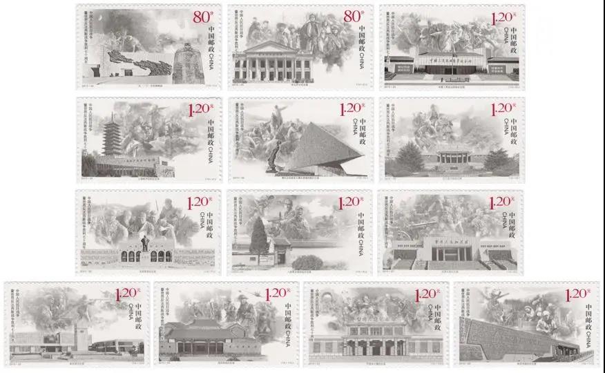 2015年9月3日上午,《中國人民抗日戰爭暨世界反法西斯戰爭勝利七十周年》紀念郵票首發式在西安市郵政公司舉行,本套郵票共13枚,小型張1枚。全套郵票面值為20.8元。《中國人民抗日戰爭暨世界反法西斯戰爭勝利七十周年》紀念郵票,是我國歷次紀念抗戰勝利題材郵票當中發行枚數最多的一套。郵票內容分別為:1.“九一八”歷史博物館;2.東北烈士紀念館;3.中國人民抗日戰爭紀念館;4.上海淞滬抗戰紀念館;5.侵華日軍南京大屠殺遇難同胞紀念館;6.臺兒莊大戰紀念館;7.延安革命紀念館;8.八路軍總部舊址紀念館;9.百團大戰紀念館;10.平型關大捷紀念館;11.冉莊地道戰紀念館;12.新四軍紀念館;13.滇西抗戰紀念館。小型張畫面以《大刀進行曲》雕塑、長城、紅綢、和平鴿為主要元素,與中國人民抗日戰爭暨世界反法西斯戰爭勝利七十周年紀念活動標識相互呼應,融為一體。