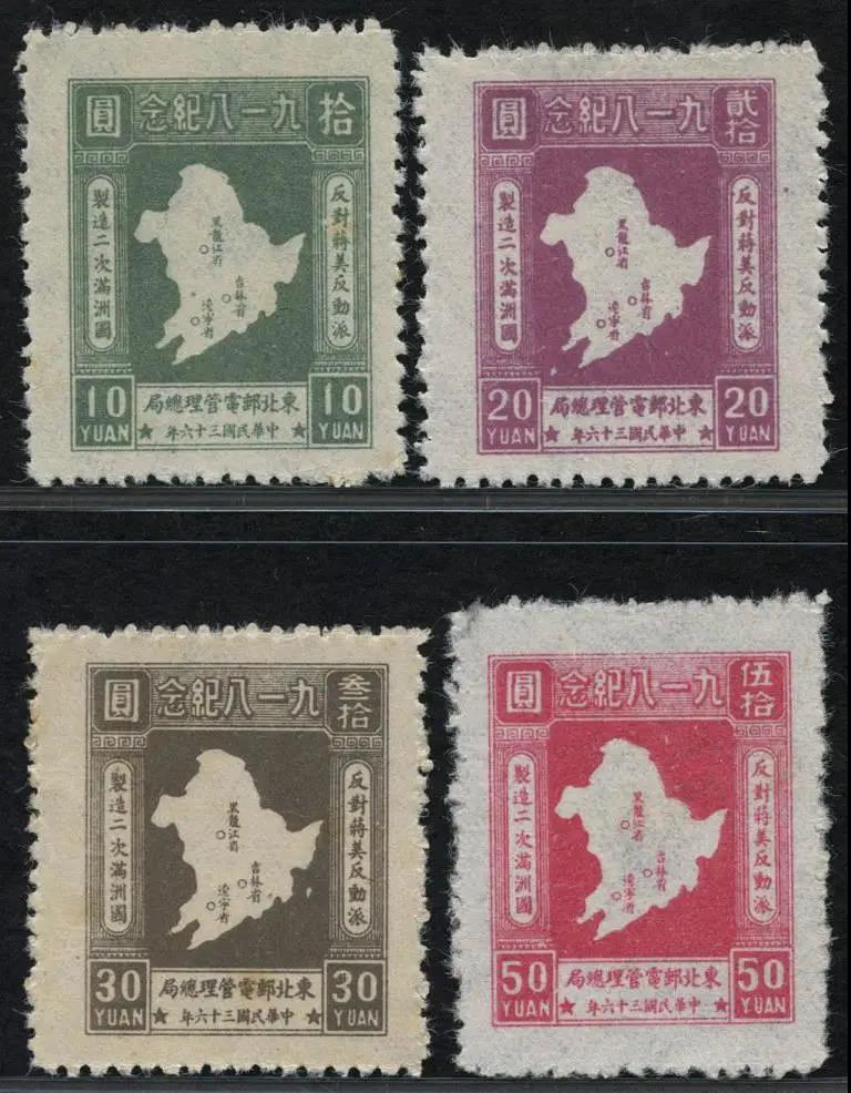 該套郵票一套4枚,圖案相同,就是刷色和面值各異。郵票的圖案主體為中國東北三省地圖,圖中明確標明三省省會的位置和各省名稱。圖案上方印刷郵票主題―“ 九一八紀念”,下方印刷“ 東北郵電管理總局★中華民國三十六年★”發行單位和發行時間,左右兩側印刷當時的口號“ 反對蔣美反動派,制造二次滿洲國”。這套郵票是由哈爾濱廣發印刷所承印,特別值得一提的是,該套郵票所用的紙張系為原偽滿洲國郵政局遺留庫存的水印絹絲紙,這也是“九一八事變”之后日本侵略者侵占了東北三省長達14年的證據之一(當時庫存之大,甚至到建國后,新中國發行的東普二也使用這款“ 水印紙 ”)。