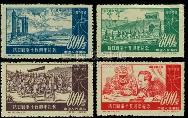 第一枚,盧溝橋風云。1952年7月7日發行了首枚《抗日戰爭十五周年紀念》郵票,這是新中國第一枚反映抗戰的郵票。這枚膠版郵票長37毫米,寬21毫米,面值為人民幣舊幣800元。孫傳哲設計,主圖為盧溝橋全景,盧溝橋的上空風起云涌,象征著日寇全面侵華戰爭的來臨,橋身兩側護欄望柱的小石獅來整有序地并行排列,好像守衛山河的忠誠戰士,橋身下靜靜流淌的永定河水,寓意著中國人民面對災難時的從容鎮定,遠處連綿起伏巍然屹立的太行群峰,宛如全民族筑起抗戰的鋼鐵長城。