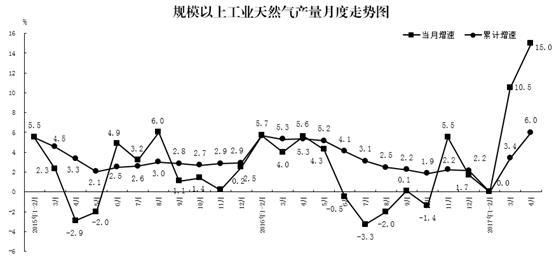 1-4月份,天然氣產(chǎn)量509.4億立方米,同比增長6.0%。進口2011萬噸[4],增長5.4%。