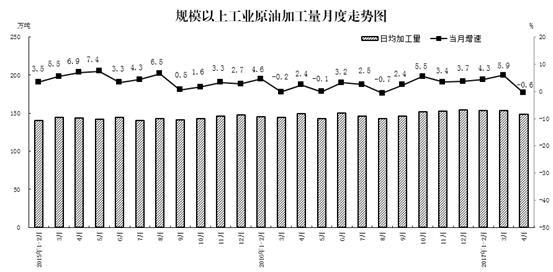 原油加工量下降。4月份,原油加工量4445.2萬噸,同比下降0.6%;日均加工量148.2萬噸,比3月份下降3.3%,這主要是受部分大型石化企業(yè)停產(chǎn)檢修影響。主要成品油生產(chǎn)也有所回落,其中,汽油產(chǎn)量同比下降4.0%,煤油產(chǎn)量增長2.2%,柴油產(chǎn)量下降0.6%。1-4月份,原油加工量18251.0萬噸,同比增長3.1%,比1-3月份回落1.4個百分點。