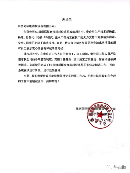 項目改造效果得到廠領導及工作人員認可,現場工程技術人員更是得到電廠上下的一致好評。項目結束后電廠立刻發來《表揚信》,信中電廠對生技部楊鑫、楊旺、肖智化、閆強、邸相武、張勇廣等員工的專業技術和工作態度給予肯定,并向我公司及工作人員標識感謝,最后“祝愿我們在今后的工作中能精誠合作,共鑄輝煌!”公司一直致力于解決火力發電廠煤倉“堵煤”、“棚煤”、“漏眼”、“板結”、煤倉狀態實時監測、煤倉安全管理等問題。自主研發、生產的HDSC煤倉綜合管理系統系列產品在國際上處于領先水平,占據國內主要市場,并遠銷海外,用戶超過800家,受到廣泛贊譽。公司生產的煤倉自動疏松裝置先后榮獲河北省中小企業質量信得過產品、名牌產品稱號,煤倉綜合控制系統被認定為河北省軟件產品。
