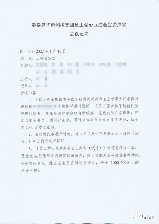 一直以來,華電測控集團始終把員工的切身利益放在首位,想員工所想,急員工所急。我們堅信:只有具有溫情和強烈社會責任感的企業,才能走得更遠!未來,華電測控集團愛心互助基金管理委員會將會繼續發揮其作用,為需要更多幫助的員工及家屬伸去援助之手,把公司的溫暖和關愛送到了廣大職工的心坎上,不斷增強職工的凝聚力,助力打造百年名企!