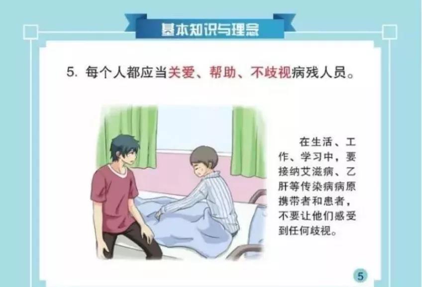 面對(duì)弱勢(shì)群體的病殘人員,人們是關(guān)愛、幫助?還是冷漠,甚至歧視?《中國公民健康素養(yǎng)—基本知識(shí)與技能》第一部分,關(guān)于基本知識(shí)和理念中的第五條,明確了“每個(gè)人都應(yīng)當(dāng)關(guān)愛、幫助、不歧視病殘人員”。