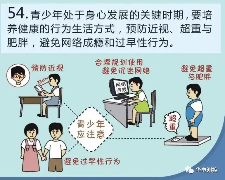 青少年是祖國的未來,提高他們的健康素養,是實現健康中國戰略目標的關鍵。《中國公民健康素養—基本知識與技能》第二部分,關于“健康生活方式與行為”,其中第五十四條強調:“青少年處于身心發展的關鍵時期,要培養健康的行為生活方式,預防近視、超重與肥胖,避免網絡成癮和過早性行為。”