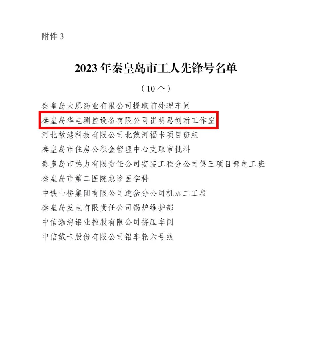 日前,秦皇島市總工會《關于授予2023年秦皇島市五一勞動獎和秦皇島市工人先鋒號的決定》(秦工字﹝2023﹞36 號)文件知悉,秦皇島華電測控設備有限公司“崔明思創新工作室”榜上有名,被秦皇島市總工會授予2023年秦皇島市工人先鋒號。