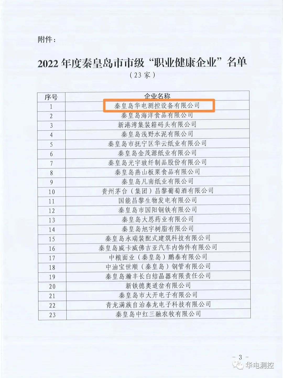 秦皇島華電測控設備有限公司獲評為2022年度秦皇島市職業健康企業