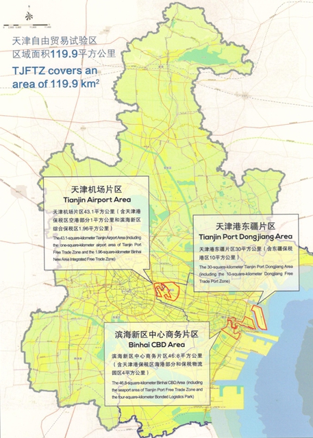 天津自貿(mào)區(qū)2014年12月31日獲國務(wù)院正式批復(fù),2015年4月21日正式掛牌,總面積119.9平方公里,是我國北方第一個自貿(mào)試驗(yàn)區(qū),也是繼上海成立自貿(mào)區(qū)以來,與福建、廣東同時獲批的第二批自由貿(mào)易試驗(yàn)區(qū)之一。其產(chǎn)業(yè)定位涵蓋了面積30平方公里,以發(fā)展航運(yùn)物流、國際貿(mào)易、融資租賃等現(xiàn)代服務(wù)業(yè)為主的天津港東疆片區(qū);面積43.1平方公里,以發(fā)展高端制造業(yè)和與之配套的生產(chǎn)性服務(wù)業(yè)為主的天津機(jī)場片區(qū);面積46.8平方公里,以發(fā)展金融創(chuàng)新為主的現(xiàn)代服務(wù)業(yè)濱海新區(qū)中心商務(wù)片區(qū)三個片區(qū)。
