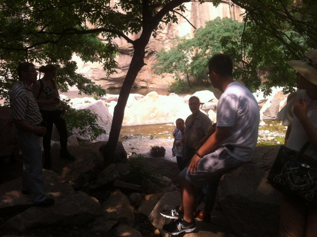 在公司總經理劉吉川先生的引領下,邁克、安娜等一行八人攀登了長壽山景區的九重天山峰,穿越一線天,駐足山巔,登高望遠,邁克和安娜無不為眼前這雄偉壯觀的風景所驚嘆。隨后,又依次參觀了懸陽洞、神醫石窟、壽字碑林等景區,領略其中的歷史文化和人文精神。在山底的一堆巖石中,劉總帶領邁克和安娜見證了“生命的力量”,這是一棵從亂石崗中生長出來的大樹,它為了生存,需要更大的力量去向下生根以獲取水源,向上攀爬以獲取陽光,用自己的生命高度地詮釋了“夾縫中求生存”,這種生命的力量激勵著劉總用更大的勇氣和信心去建設華電測控。美國友人邁克感同身受,感慨道:“No pain, no gain.”(譯文:沒有痛苦,就沒有收獲)。安娜則對中醫文化情有獨鐘,劉吉川先生向她講解了刮骨療傷的故事,并借著李時珍、華佗等神醫石窟的雕像,概述了中國中醫文化的歷程。安娜不時地給雕像和碑文拍照,并把劉總的講解記錄在了她的日記本中,安娜說她回國后馬上就要開始讀醫學的研究生,劉總生動的講解激發了她對醫學,特別是中醫學的興趣,真是起到了拋磚引玉的作用。