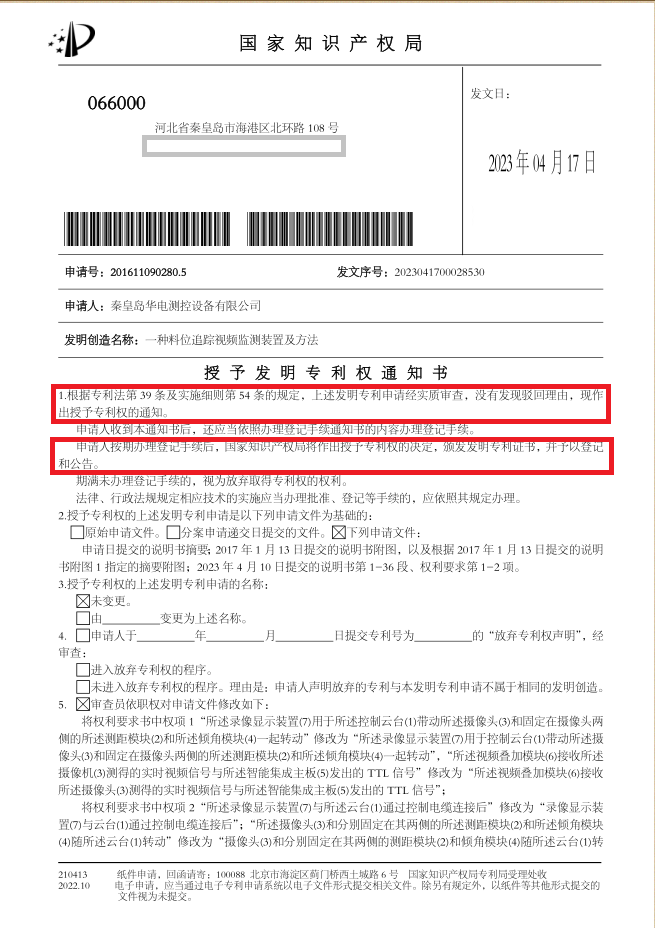 華電測控設備有限公司又獲一項發(fā)明專利” 2023-04-252023年4月17日,秦皇島華電測控設備有限公司收到國家知識產(chǎn)權(quán)局發(fā)來的《一種料位追蹤視頻檢測裝置及方法辦理登記手續(xù)通知書》和《一種料位追蹤視頻檢測裝置及方法授予發(fā)明專More