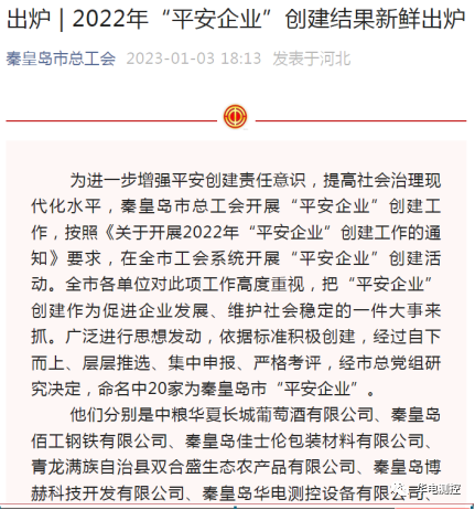 秦皇島華電測控設備有限公司被命名為2022年秦皇島市“平安企業”” 2023-01-212022年,為進一步增強企業安全生產主體責任和全員安全責任意識,有效提升企業安全管理水平,秦皇島華電測控設備有限公司響應秦皇島總工會開展的“平安企業”創建工作,按照《關于開展2022年“平安企業”創建工作的通知》要求,打造高標準“平安企業”。經過嚴格考評,秦皇島華電測控設備有限公司被秦皇島市總工會命名為2022年秦皇島市“平安企業”。More