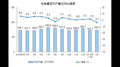 統(tǒng)計局:3月國內發(fā)電量同比下降3.7%” 2015-04-16(中國電力網訊)4月15日,國家統(tǒng)計局公布3月份規(guī)模以上工業(yè)增加值數據,2015年3月份,規(guī)模以上工業(yè)增加值同比實際增長5.6%,比1-2月份回落1.2個百分點。從環(huán)比看,3月份,規(guī)模以上工業(yè)增加值比上月增長0.25%。一季度,規(guī)模以上工More