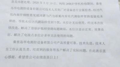 2020年5月15日,華電測控收到來自新疆某化工有限公司的表揚信,表揚我公司解決了該廠鍋爐汽包電接點水位計多年無法使用的問題。信中對我公司的產(chǎn)品質(zhì)量、全新全意為客戶服務(wù)的理念以及技術(shù)人員認(rèn)真負(fù)責(zé)的工More